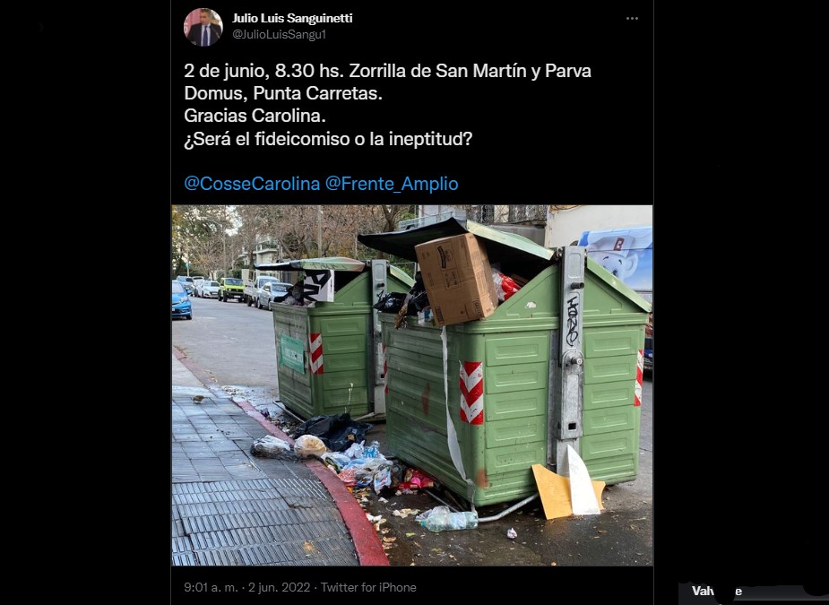The vice president of UTE (and son of former president Julio María Sanguinetti), Julio Luis Sanguinetti, criticized the mayor of Montevideo, Carolina Cosse, for the issue of garbage outside the containers.